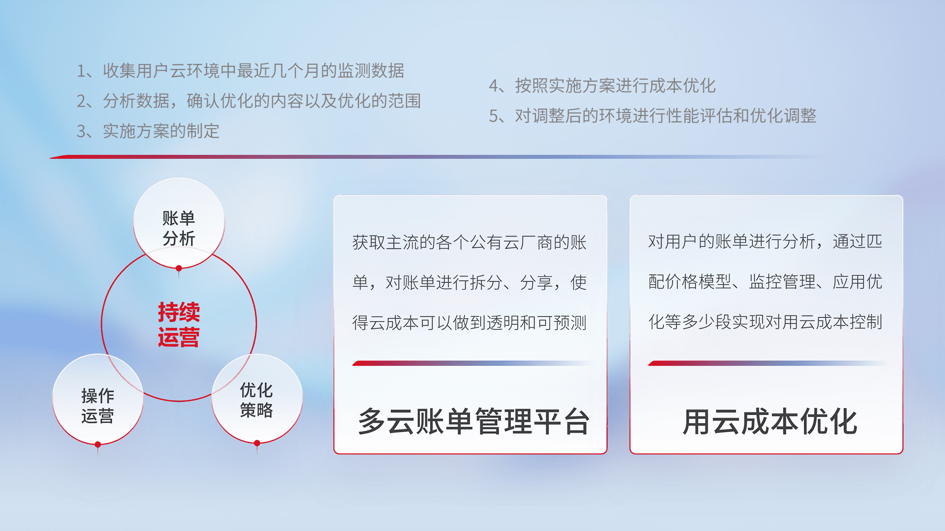 通过多云纳管,,以统一的资源数据模型把客户的云资源进行抽象和封装,,,进而实现对多云资源的统一操作,,,保障云资源管理的可靠性、、、、稳定性与可用性。。量身定制化运维内容,,,配置、、、开发运维、、补丁管理、、备份、、、、监控、、认证和访问管理、、、、审计和日常巡检等,,,,保障在用云过程中的可靠度,,稳定度以及高可用率。。。。